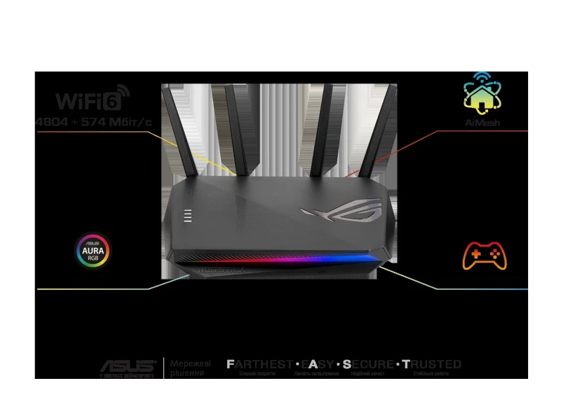 Тип: WiFi маршрутизатор; Тип модема: внешний; Интерфейс: RJ45 for Gigabits BaseT for WAN x 1; RJ45 for Gigabits BaseT for LAN x 4; USB 3.2 Gen 1 x 1; RAM память: 512 МБ; Flash память: 256 MB; Индикаторы: POWER; WAN; 5G; 2.4G; Стандарты: IEEE 802.11b; IEEE 802.11a; IEEE 802.11g; IEEE 802.11n; IEEE 802.11ac; IEEE 802.11ax; IPv4; IPv6; Количество антенн: 4 шт.; Диапазон частот: 2.4 ГГц + 5 ГГц; Количество ядер процессора: 3