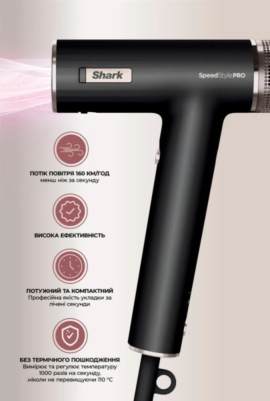 Бренд: Shark; Мощность, Вт: 1750; Количество скоростей: 3; Количество температурных режимов: 3; Количество насадок: 3; Питание: сеть; Щелевая (концентратор): есть (1); Щетка: есть (1); Другие насадки: насадка для сушки и разглаживания (1); Ионизация: есть