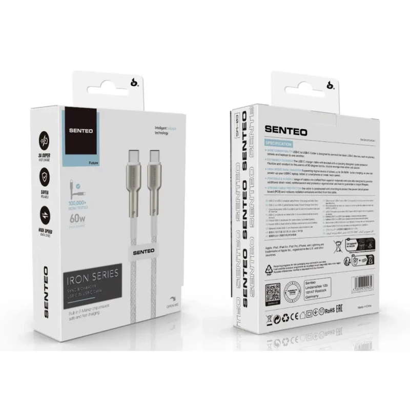 Кабель SENTEO SM-03 Iron series 60W Type-C to Type-C 1m White