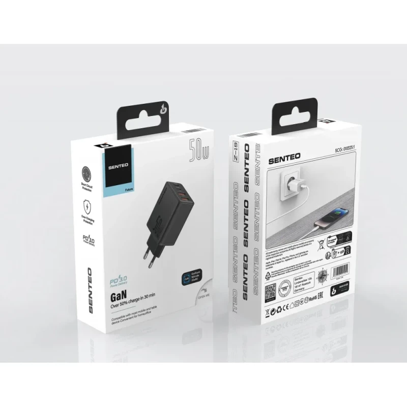 Входное подключение: сеть / Быстрая зарядка: GaN PD / Количество USB портов: 2 USB + 2 USB-C / Мощность: 50W / Сила тока: 3A / Цвет: черный