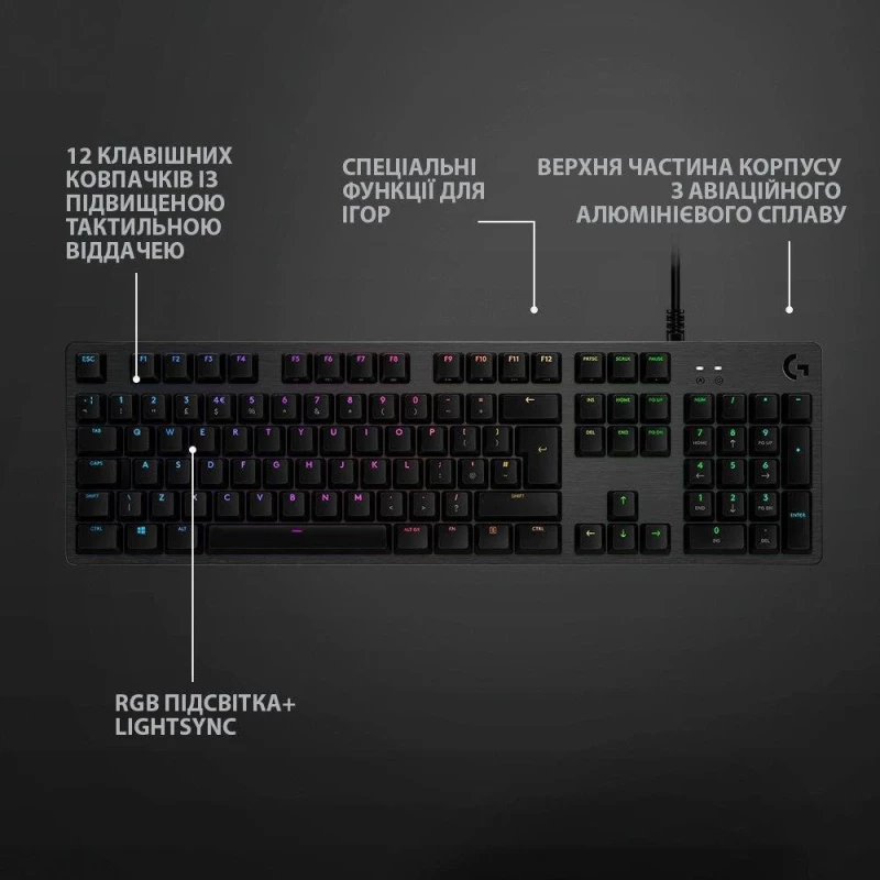 Бренд: Logitech; Проводное подключение: есть; Интерфейс коммуникации с ПК: USB; Формфактор клавиатуры: стандартная; Тип клавиш: механический; Характеристика нажатия свитчей: тактильные; Сила нажатия свитчей, г: 50; Модель свитчей: GX Brown; Цифровой блок: есть; Металлический корпус: есть