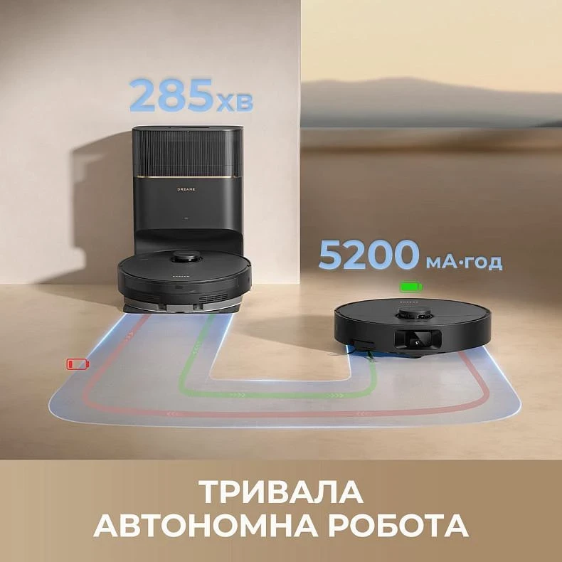 Бренд: Dreame; Площадь уборки, м.кв.: 100 и более; Тип покрытий: Виниловый пол, Линолеум, Ворсистый ковер, Кафель, Ковролин, Ламинат, Паркет, Плитка; Сила всасывания, Па: 13000; Емкость пылесборника, мл: 500 (робот), 5000 (база); Емкость для воды, мл: 350; Уровень шума, дБ: 74; Тип аккумулятора: Li-ion 5200 mAh; Время работы от аккумулятора, мин: 285; Высота преодолеваемого порога, мм: 20