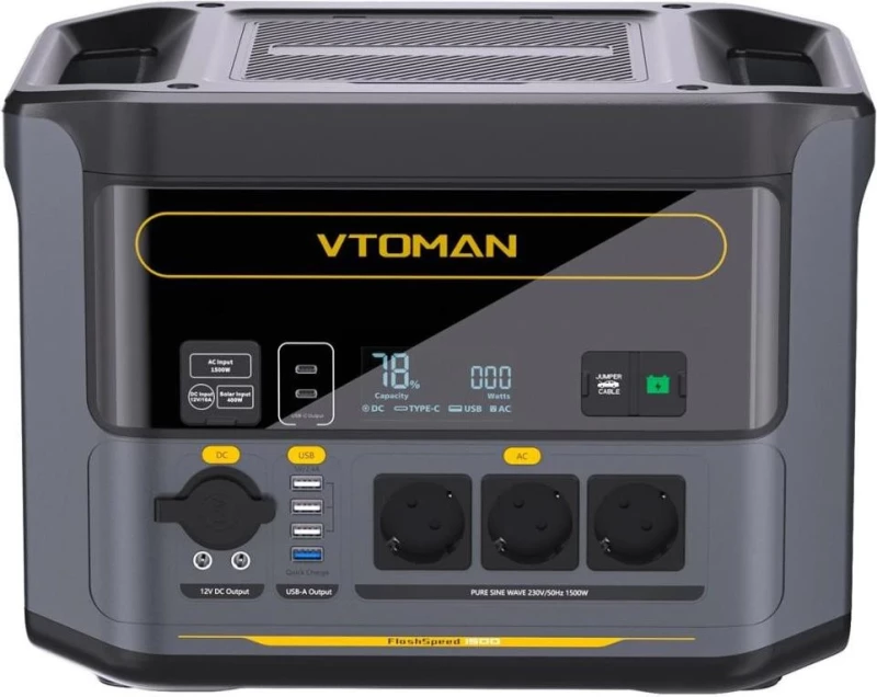 Бренд: Vtoman; Розетка AC 230В: 3; USB Type-C: 2; USB Type-A: 4; DC: 2; Автомобильная розетка (прикуриватель): 1; Номинальная мощность, Вт: 1500; Пиковая мощность, Вт: 3000; Мощность USB Type-C, Вт: 100; Мощность USB Type-A, Вт: 18; 12